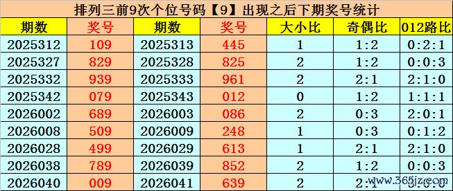 个位号码:上期奖号为大号、奇数、0路号码:9,历史上个位号码9共开出781期,前一次出现在第2026040期,上期奖号为重号。