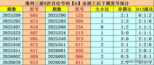 在百位前9次出现号码6之后,下期百位分别开出奖号:1-0-2-5-3-6-8-0-8,其中开出号码个数奇偶比是3:6,大小比是4:5,012路比是4:1:4。