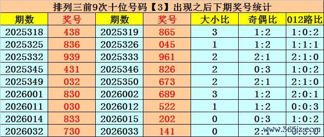 在十位前9次出现号码3后,其下期奖号分别开出:6-4-6-2-7-8-2-0-4,其中奖号个数奇偶比是1:8,大小比是4:5,012路比是3:3:3。